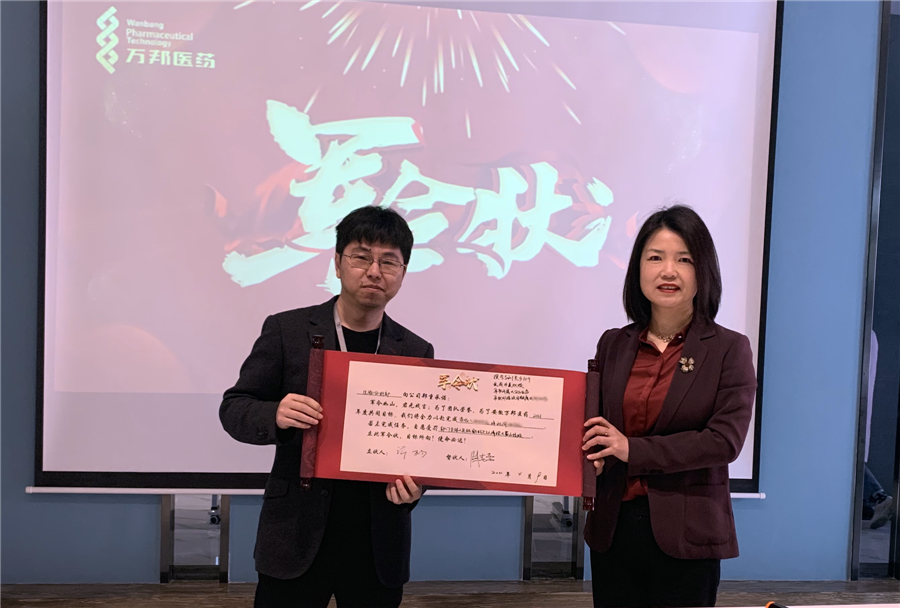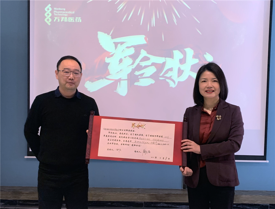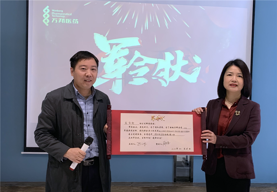 各業(yè)務(wù)部門負責人進行軍令狀宣讀并立下2021年度任務(wù)規(guī)劃,安徽萬邦醫(yī)藥董事長陶春蕾女士出席會議并作為督狀人與全體員工共同見證。