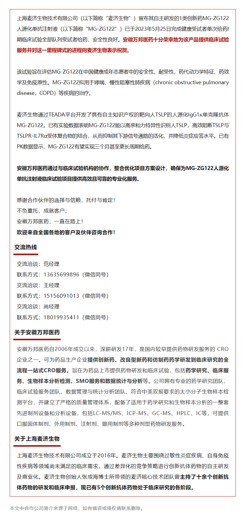 喜訊|安徽萬(wàn)邦醫(yī)藥助力麥濟(jì)生物MG-ZG122人源化單抗注射液完成Ⅰ期臨床給藥